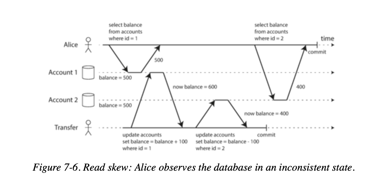 This anomaly is called a nonrepeatable read or read skew. In Alice’s case, this is not a lasting problem, because she will most likely see consistent account balances if she reloads the online banking website a few seconds later.